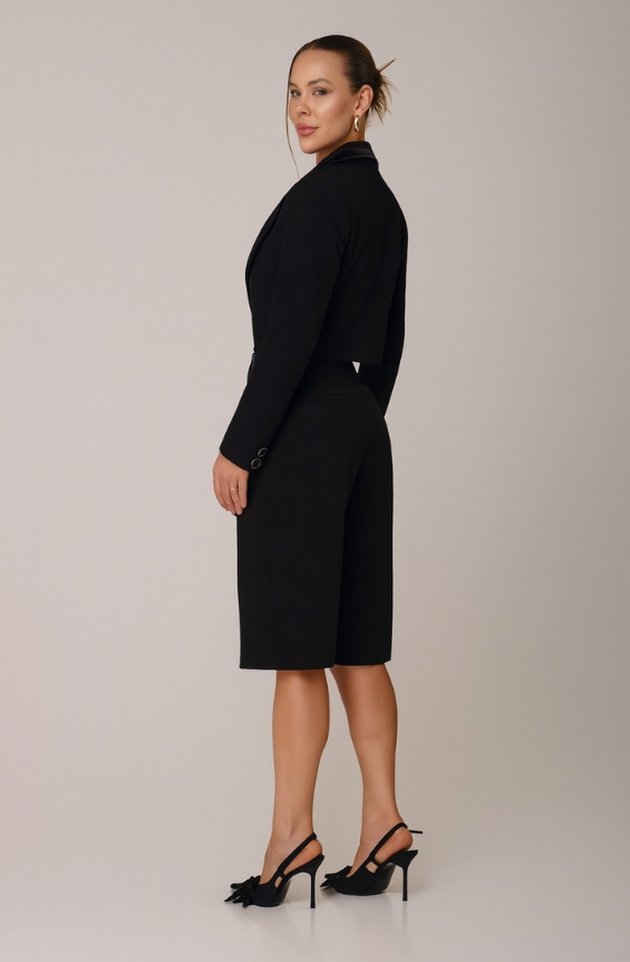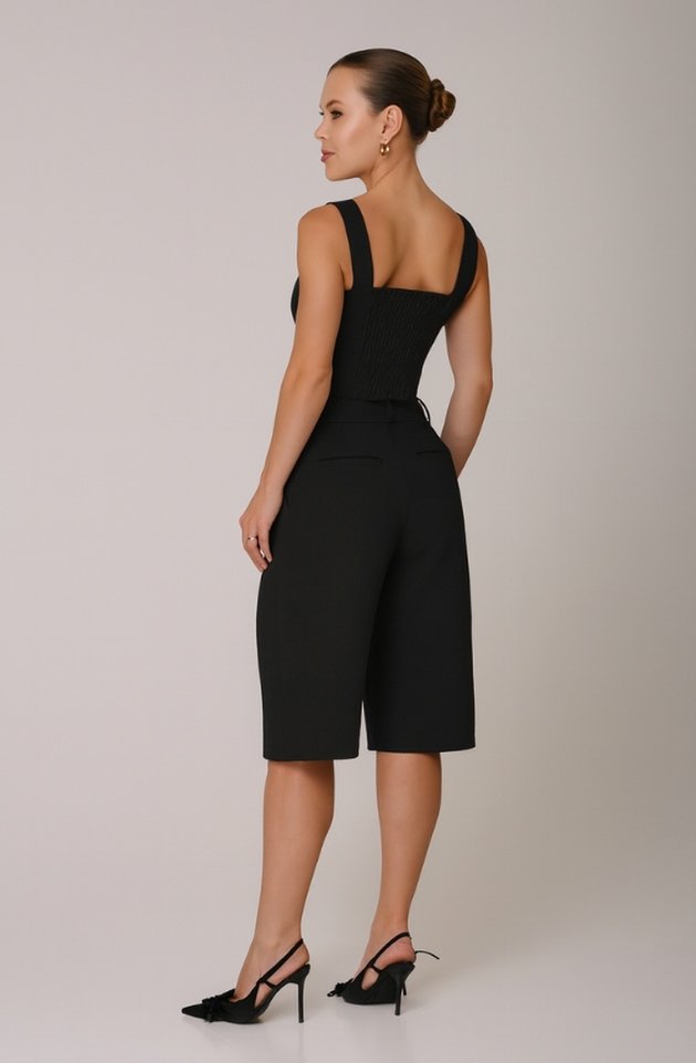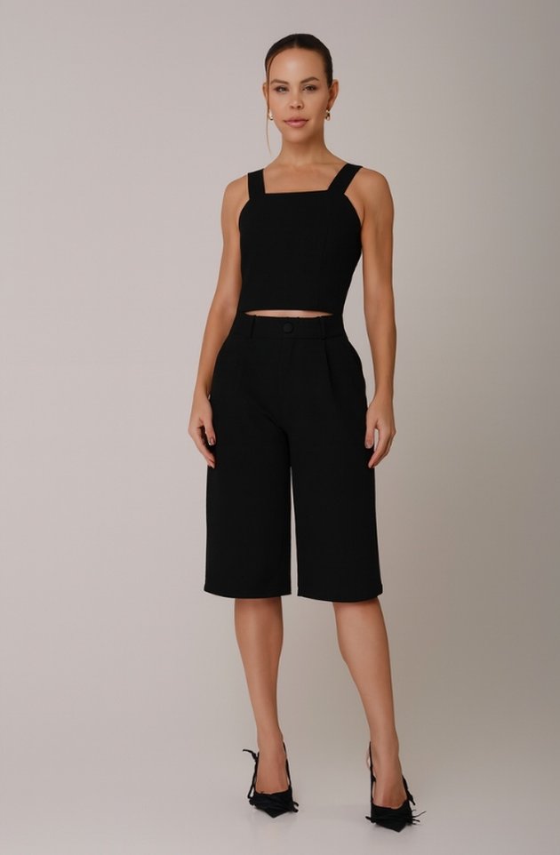 A Bermuda Leonora traduz o poder da alfaiataria contemporânea em uma versão sofisticada e versátil. Com comprimento abaixo do joelho e corte reto, a peça valoriza a silhueta de forma elegante e atemporal. O tecido estruturado garante caimento impecável e liberdade de movimento, tornando-a ideal para composições que equilibram sofisticação e leveza.