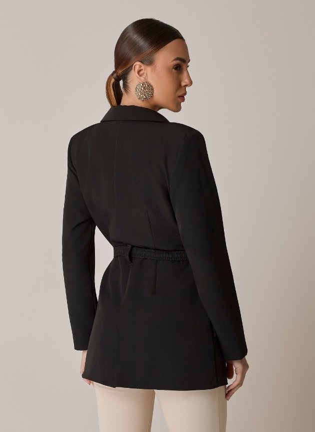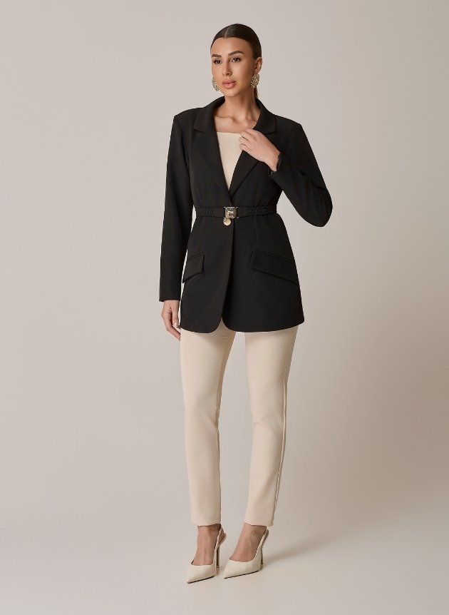 O Blazer Pala é um ícone da alfaiataria moderna. Com corte preciso e caimento impecável, a peça valoriza a silhueta por meio do cinto com fivela dourada, que adiciona um toque de refinamento ao visual. As lapelas amplas e os bolsos com pala reforçam o estilo contemporâneo, enquanto o tecido encorpado garante estrutura e conforto. Ideal para produções elegantes e versáteis, que vão do ambiente corporativo a ocasiões especiais.