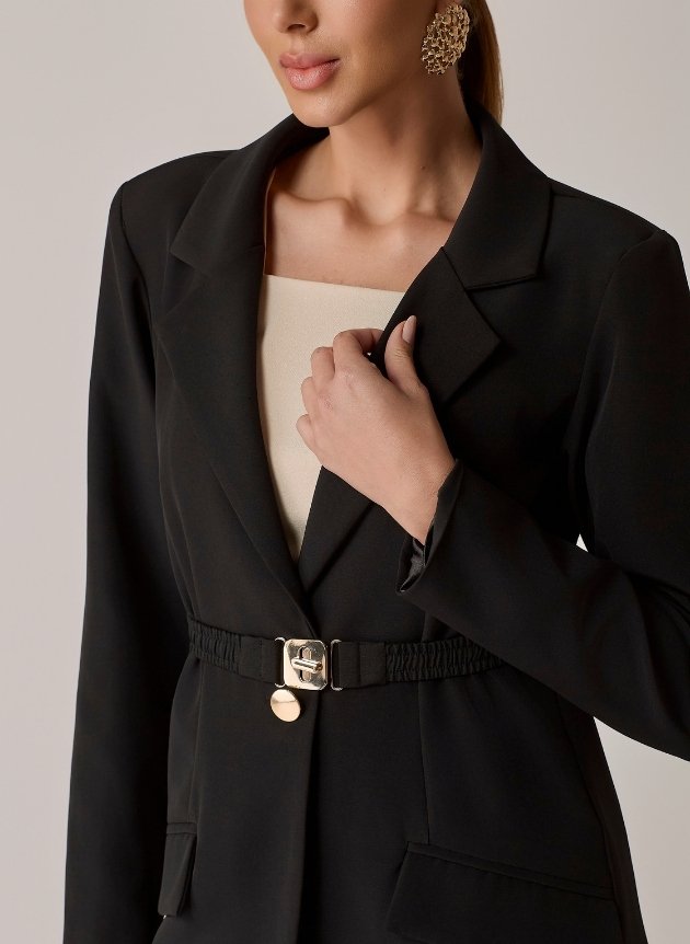 - Modelagem acinturada com pala e cinto com fivela dourada