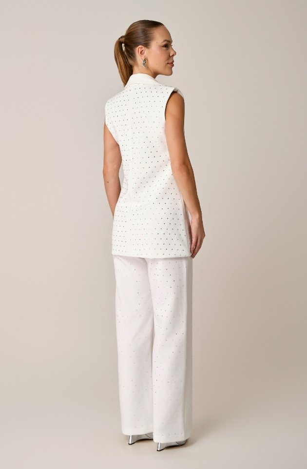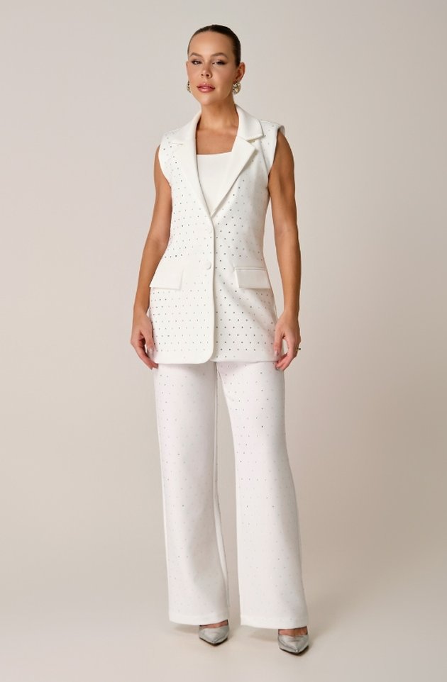 A Calça Lúmina é a fusão perfeita entre sofisticação e protagonismo. Confeccionada em alfaiataria de gramatura média, possui modelagem pantalona que garante movimento fluido e elegante. Os bolsos laterais e o botão forrado complementam o design com discrição e funcionalidade. O grande destaque fica por conta da aplicação de pedras de cristal por toda a peça, que adicionam brilho com refinamento. Uma calça que traduz a elegância de quem deseja se destacar com classe.