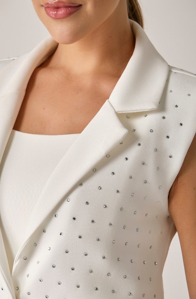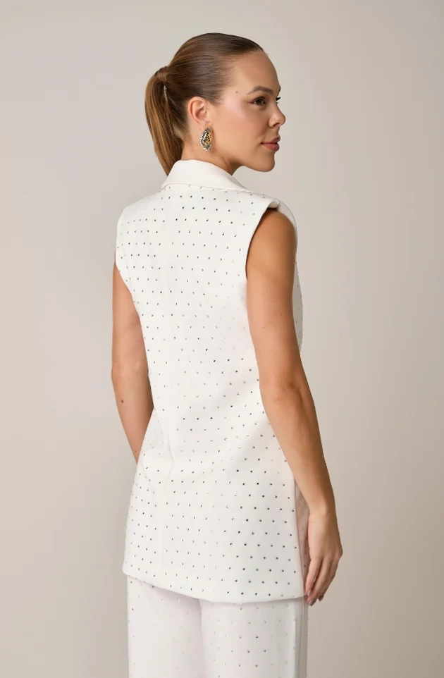 O Colete Lúmina é uma peça que irradia elegância e personalidade. Confeccionado em alfaiataria de gramatura média, possui forro em cetim com elastano, garantindo conforto e caimento impecável. A gola blazer com botões forrados e as ombreiras estruturadas reforçam a imponência da modelagem alongada. O destaque fica por conta da aplicação de pedras de cristal em toda a peça, que acrescentam brilho com sofisticação, sem excessos. Ideal para quem deseja um visual marcante e refinado.