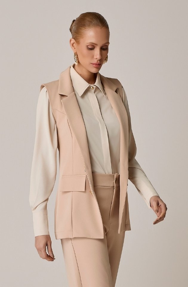 O Colete Clínic é a peça perfeita para sobreposições elegantes e versáteis no ambiente profissional. Confeccionado em crepe de alfaiataria, possui modelagem alongada com gola blazer que valoriza a silhueta com sofisticação. O abotoamento frontal com botões dourados confere um toque de brilho discreto, enquanto os bolsos com lapela sobreposta unem funcionalidade e estilo. Leve e refinado, ele transforma qualquer composição com sutileza e presença.