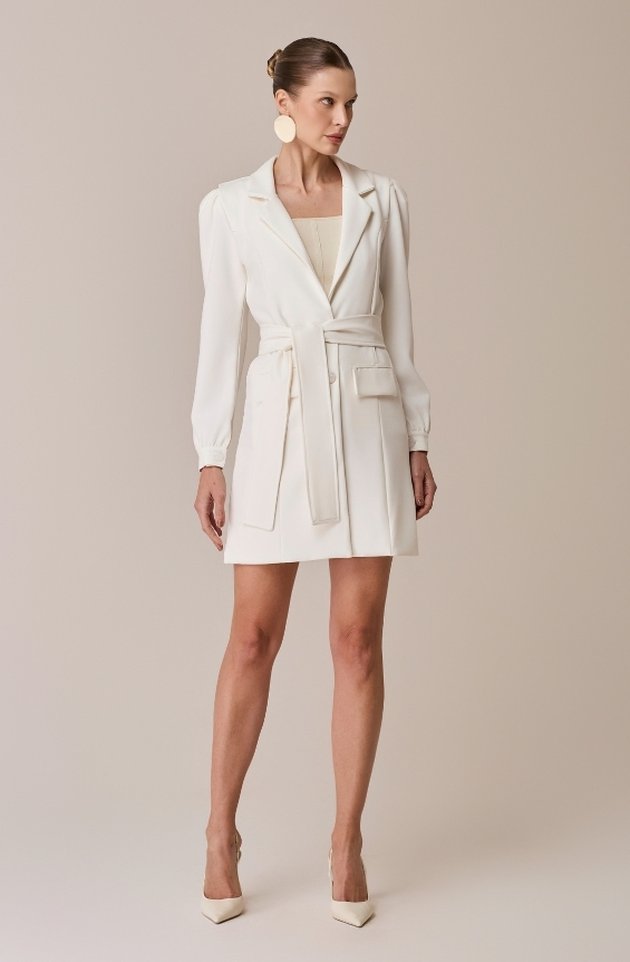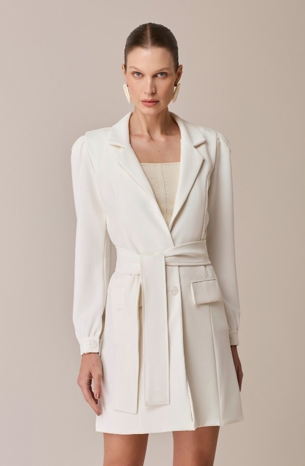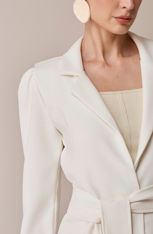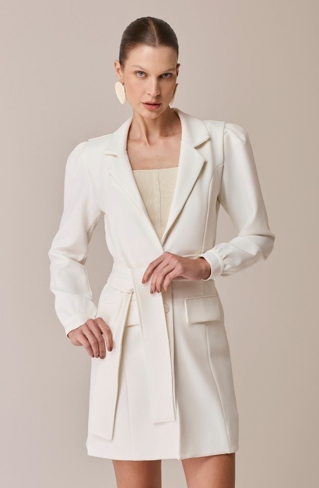 O Jaleco Gaia combina estrutura e delicadeza em uma peça elegante e versátil. Confeccionado em alfaiataria premium, possui modelagem acinturada que valoriza a silhueta, bolsos com lapela funcionais e faixa no mesmo tecido para ajuste na cintura. Suas mangas bufantes trazem um toque romântico e podem ser ajustadas para o comprimento 7/8 por meio de botões discretos no punho, adaptando-se ao estilo e à ocasião com leveza e sofisticação.