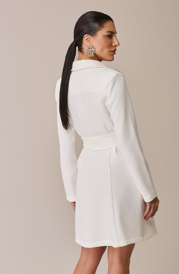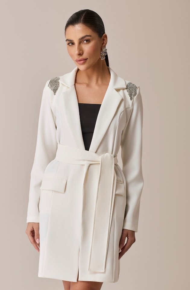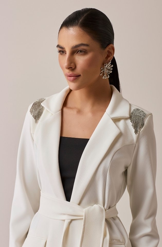 O Jaleco Isla é a fusão perfeita entre elegância e brilho sutil. Confeccionado em alfaiataria premium, possui modelagem clássica com gola blazer e ombreiras que estruturam o visual com imponência. Os bolsos frontais trazem funcionalidade, enquanto o fechamento em colchete metalizado mantém a estética limpa e sofisticada. A faixa para amarração permite acinturar a peça conforme o estilo de quem veste. O destaque fica por conta do bordado em strass nos ombros, que adiciona um toque de glamour delicado e atemporal.