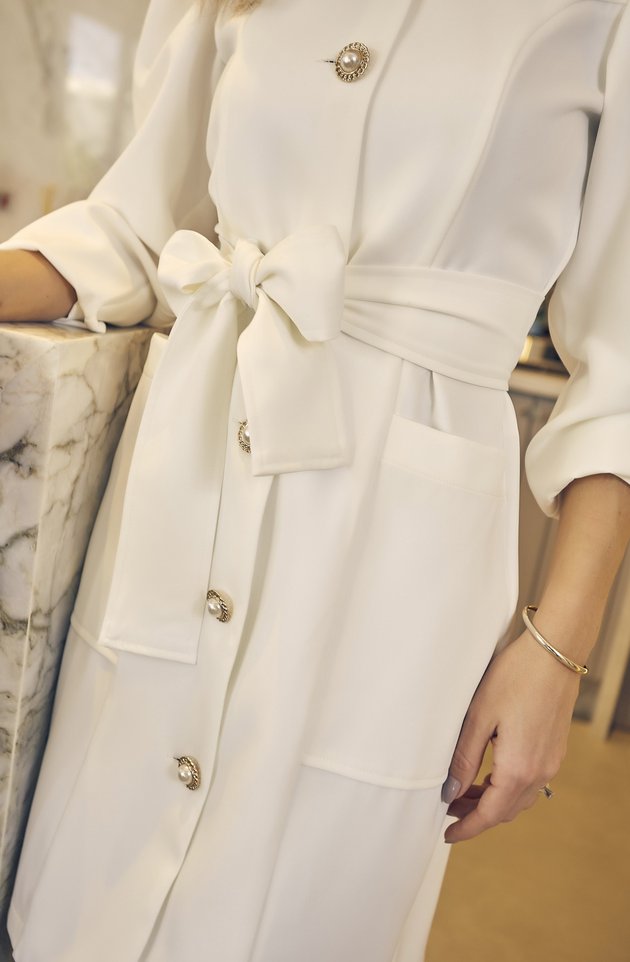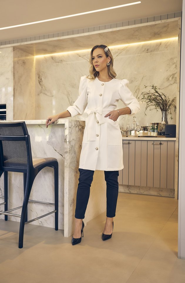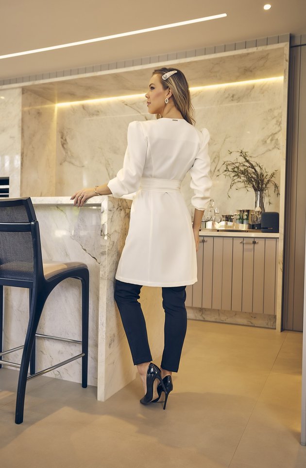 Com design elegante e presença marcante, o Blazer Alongado LECLOÁ é confeccionado em alfaiataria premium, com modelagem levemente acinturada e comprimento estendido. As mangas longas com ombreiras internas reforçam a postura e a imponência da peça, enquanto os bolsos frontais garantem funcionalidade. O fechamento é feito com botões diferenciados dourados com pérolas, que adicionam um toque de brilho sutil e refinado. Acompanha faixa para amarração, permitindo ajuste personalizado com charme.
