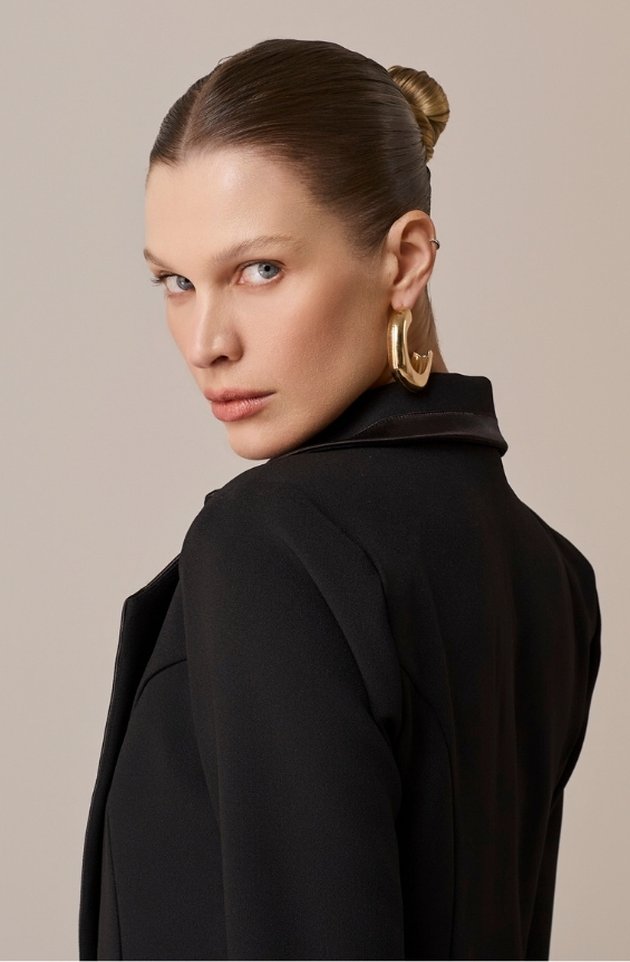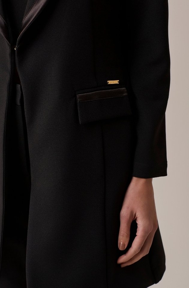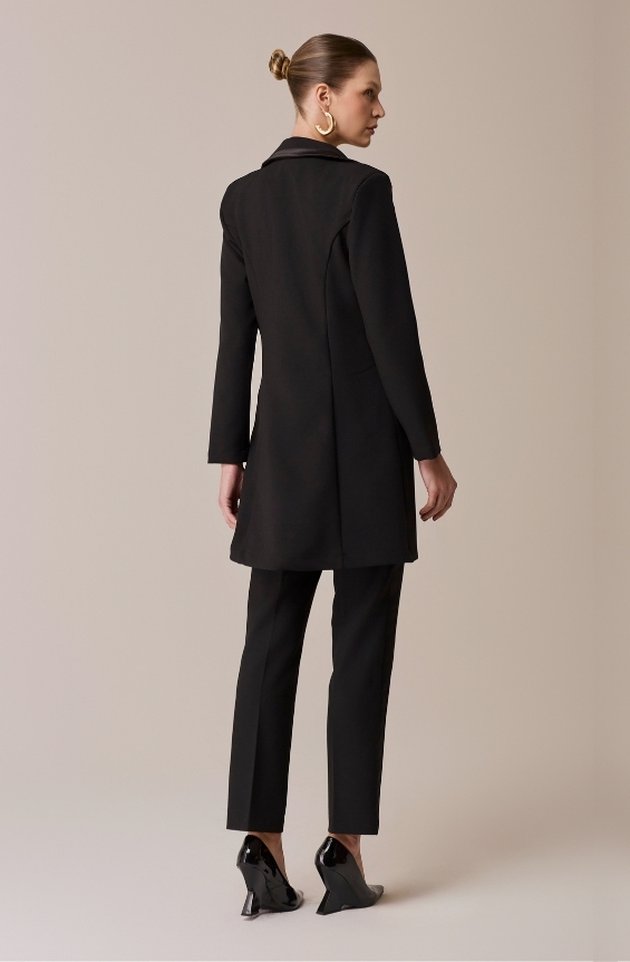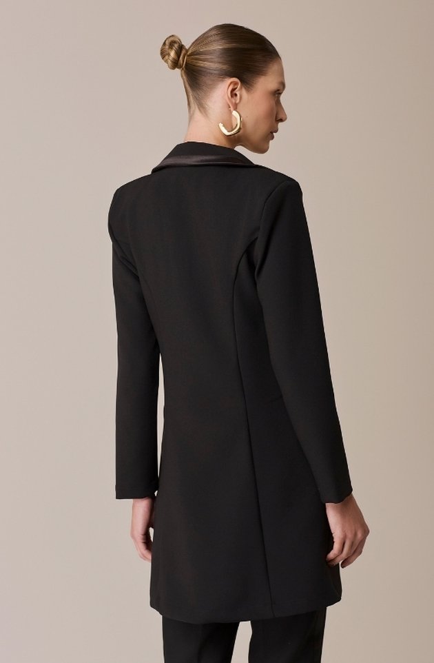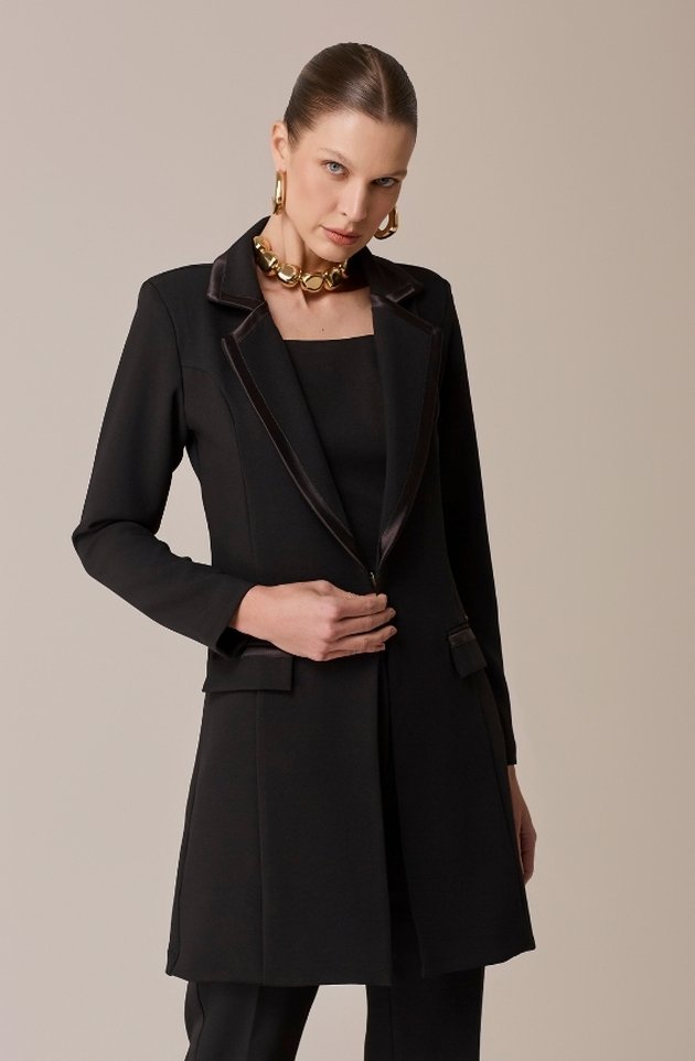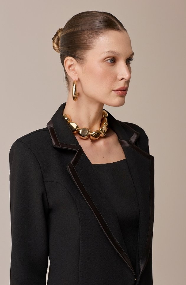 Na versão preta, o clássico Jaleco Zoe ganha ainda mais elegância e força visual. Confeccionado em alfaiataria de alta gramatura, possui gola estilo blazer, ombreiras estruturadas e fechamento com gancho metálico discreto. Os detalhes em viés acetinado elevam o acabamento da peça, enquanto os bolsos frontais adicionam funcionalidade sem abrir mão da estética refinada. Um jaleco que traduz autoridade, sofisticação e estilo com precisão.