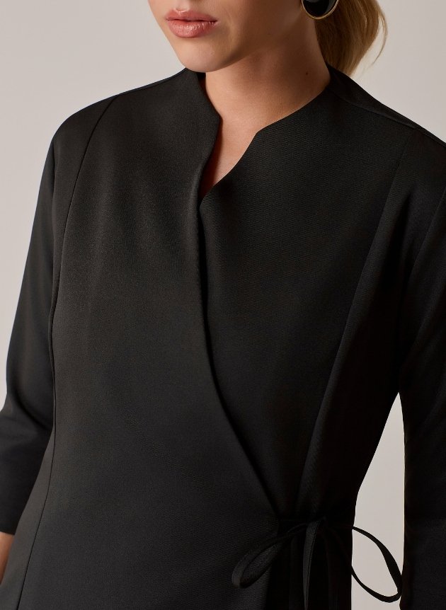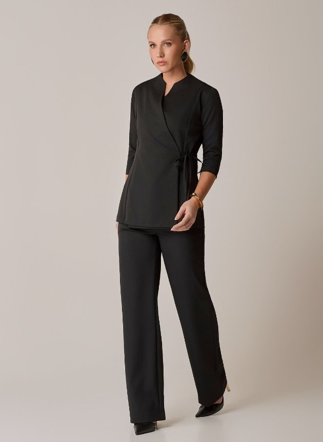 O Kimono Envelope é a união perfeita entre conforto e sofisticação. Sua modelagem acinturada, com amarração lateral e decote em “V”, realça a silhueta de forma sutil e refinada. O design cruzado garante um caimento impecável e adaptável, ideal para composições profissionais e elegantes. O tecido estruturado e o corte preciso reforçam o DNA da alfaiataria contemporânea da LECLOÁ.