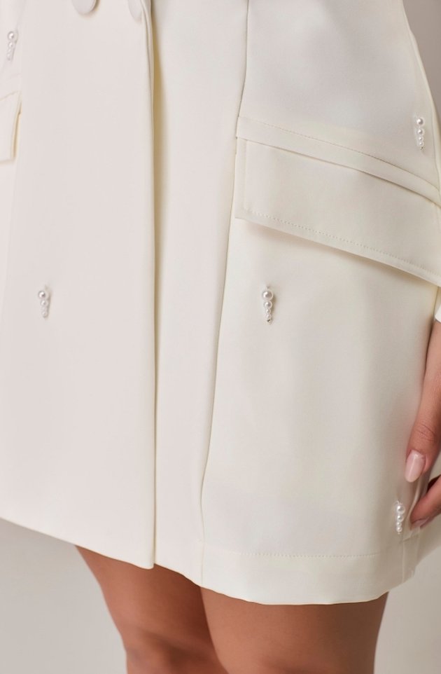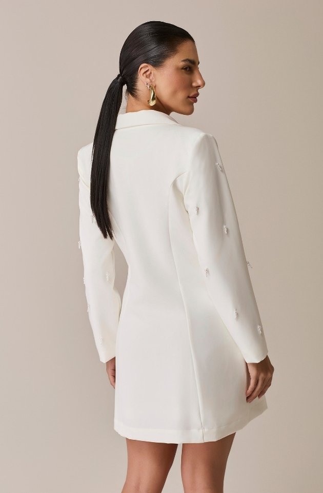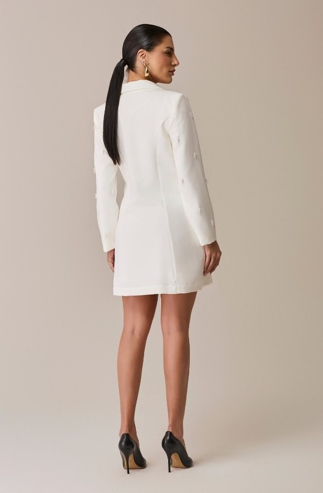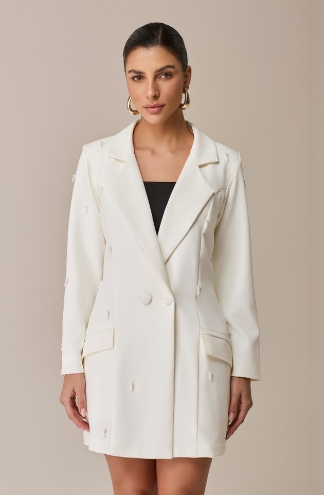 Sucesso absoluto da marca, o Maxi Blazer Cléo retorna em sua versão off white com ainda mais charme e sofisticação. Confeccionado em alfaiataria estruturada com forro em cetim, possui ombreiras que valorizam a postura e bolso com lapela funcional. O grande destaque fica por conta do bordado manual em pérolas com pendentes, que criam um efeito visual de movimento refinado. Uma peça imponente, perfeita para clínicas ou para elevar composições do dia a dia com um toque de luxo.