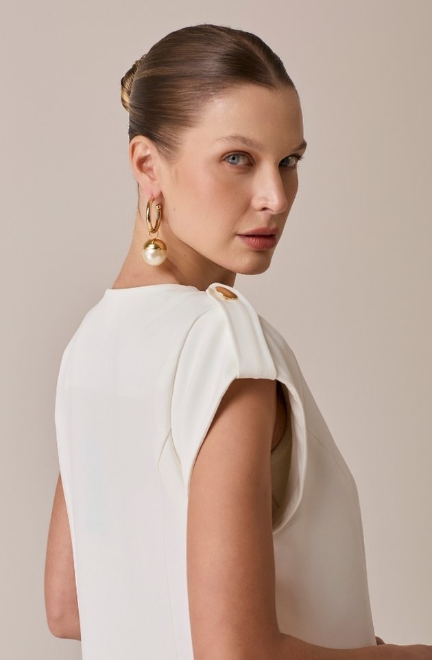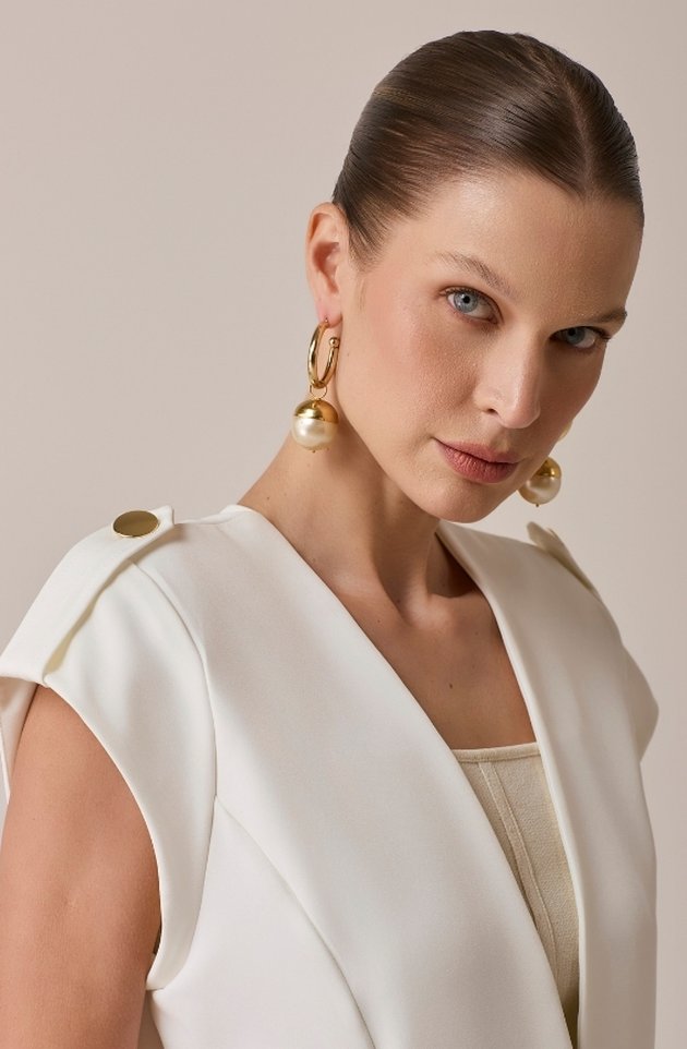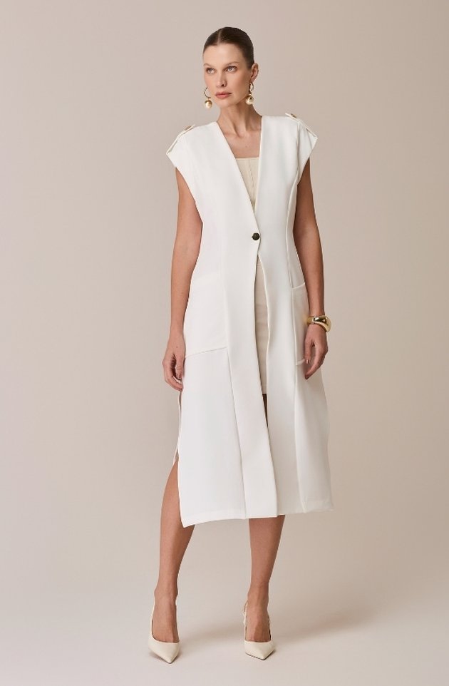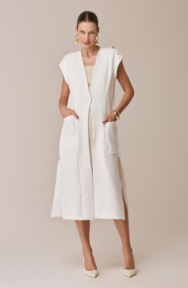 Confeccionado em alfaiataria premium, este maxi colete combina presença e refinamento em cada traço. Com modelagem alongada e levemente acinturada, possui pequeno transpasse frontal com abotoamento em botão dourado, além de aberturas laterais que garantem conforto e movimento. Os bolsos chapados adicionam funcionalidade com discrição. O destaque fica por conta das ombreiras e do detalhe em martingale com botões dourados nos ombros — um charme especial que valoriza ainda mais a peça.