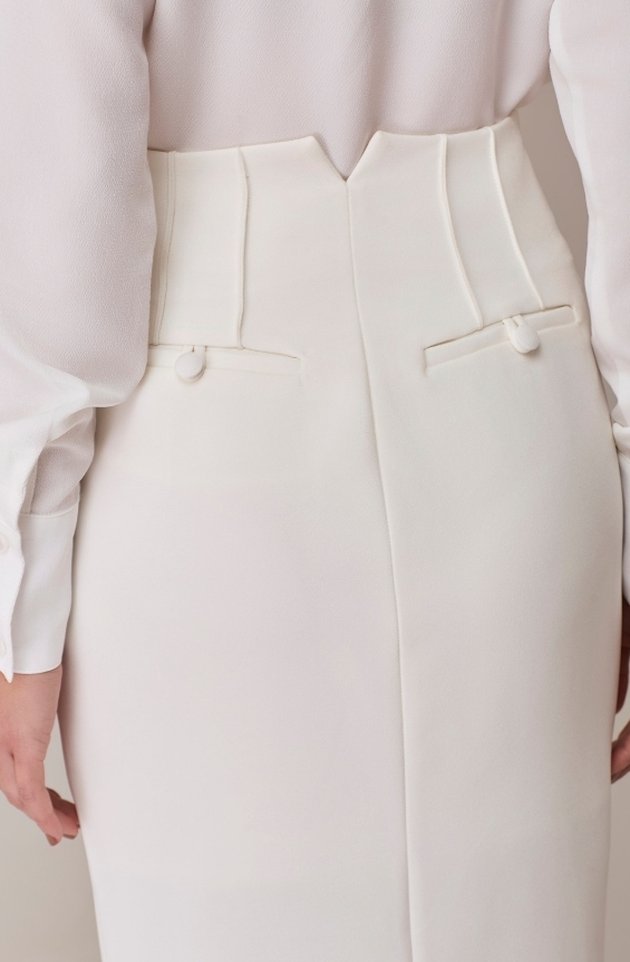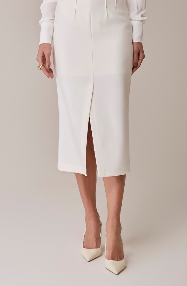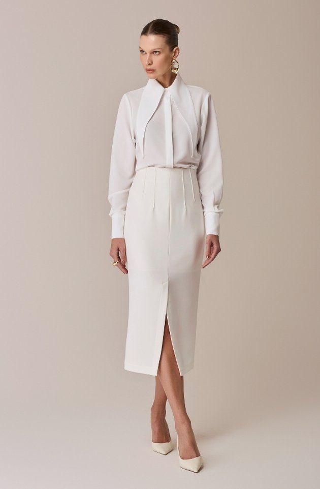 A Saia Claire une sofisticação e estrutura em uma peça que valoriza a silhueta com elegância. Confeccionada em alfaiataria de gramatura alta, possui forro em cetim com elastano, garantindo conforto e acabamento impecável. A modelagem midi é complementada por uma fenda frontal que adiciona leveza ao visual, Enquanto os detalhes estruturados no cós acrescentam elegância e acabamento refinado à peça. Ideal para composições elegantes e versáteis no ambiente profissional.
